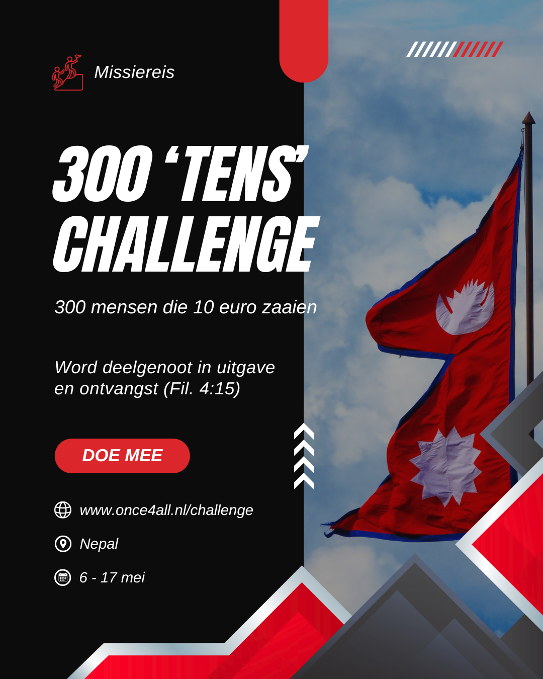 Het hart van God is om te geven. Deze challenge geeft jou de mogelijkheid om gelijk aan Gods hart te handelen. God geeft daar mooie beloftes bij: “Ik zal zegenen wie u zegenen (Gen. 12:3).” En “mijn God zal u, overeenkomstig Zijn rijkdom, voorzien van alles wat u nodig hebt, in heerlijkheid, door Christus Jezus (Fil. 4:19).”